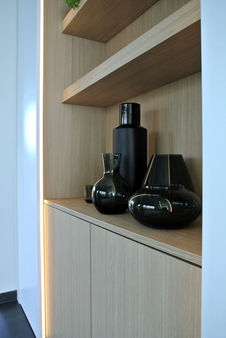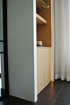 Deze klanten waren op zoek naar een sprekend, maar tijdloos tv-meubel. Hiervoor hebben we gekozen om de volledige muur te benutten. Zo dient het niet alleen als tv-meubel, maar ook als de doorgang naar de hal. Daarnaast is er nog extra opbergruimte voorzien, en kan het meubel persoonlijk aangekleed worden door leuke decoratie.